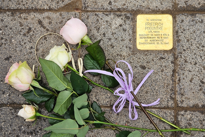 Heute ist der Tag des Gedenkens an die Opfer des Nationalsozialismus. Wenn es darum geht queeren Opfern zu gedenken, wo siehst du die größten Lücken? Eine Sache, die sehr wichtig ist, ist Sichtbarkeit. Seit dem Anfang meiner Karriere setzte ich mich dafür ein, dass es in Polen auch Stolpersteine für die Menschen gibt, die nach Paragraf 175 StGB verurteilt wurden – letztes Jahr wurden die ersten zwei verlegt, für Friedrich Poguntke and Egbert Kipke. Das war ein historischer Moment und trotzdem kam niemand vom deutschen Konsulat in Wrocław oder der Botschaft in Warschau. Im Nachhinein hat mir allerdings eine Freundin ein Bild von den Stolpersteinen geschickt: Jemand hatte eine Kerze angezündet und auf einen Zettel geschrieben „Wir werden uns an euch erinnern, ihr seid nicht allein“. Das hat mich sehr berührt und ist der Grund, warum ich für diese Geschichten kämpfe.